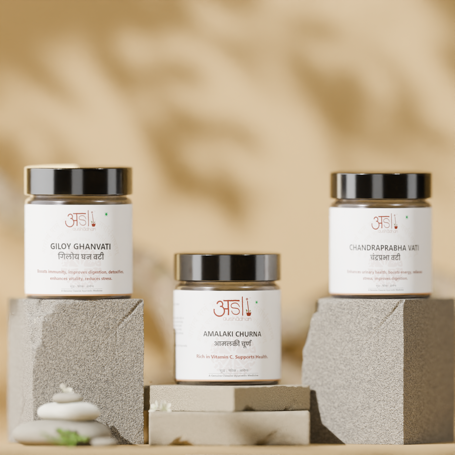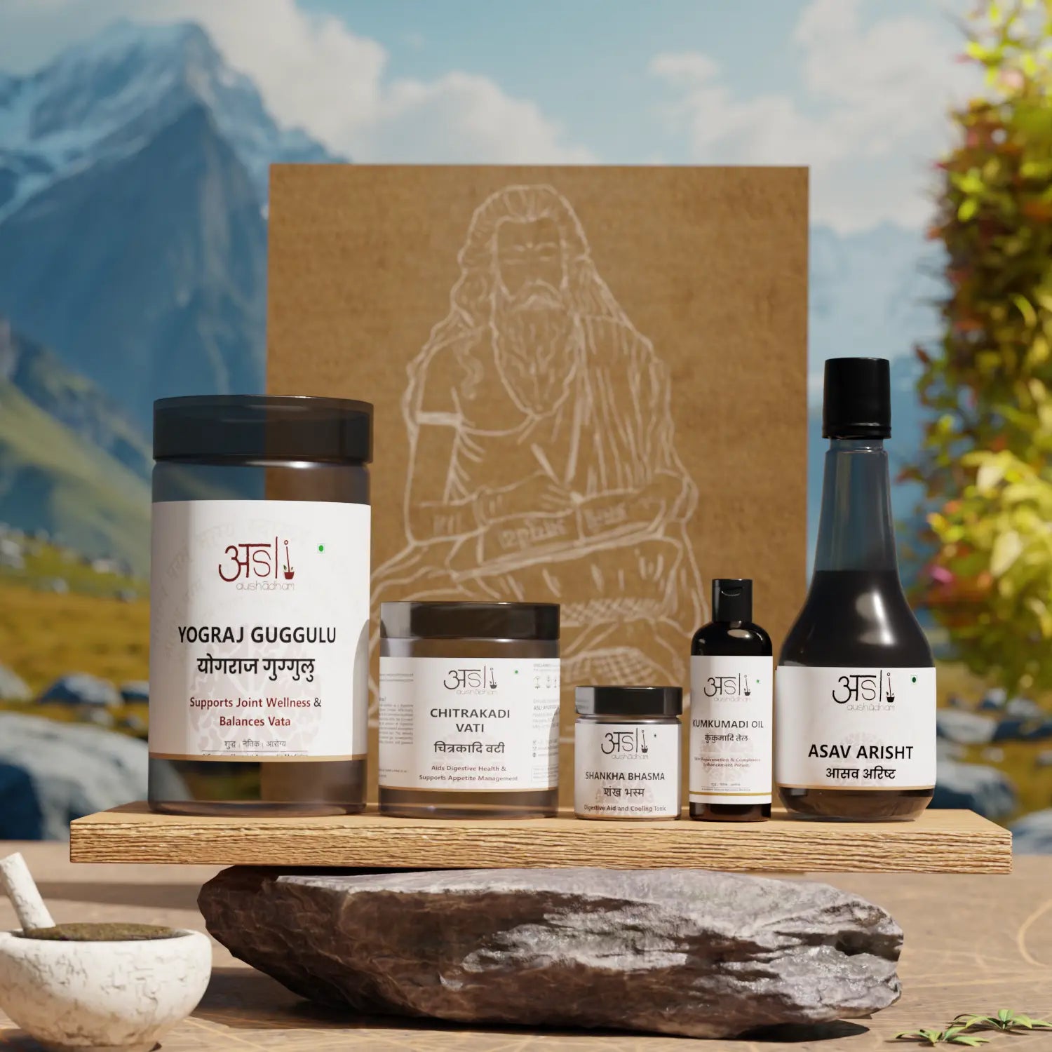 The Asli Aushadham Ayurveda Essentials Kit is a meticulously curated collection of classical Ayurvedic remedies, inspired by the ancient and time-honored texts of Ayurveda. This comprehensive first aid kit is designed to be your go-to solution for everyday health concerns, bringing the wisdom of ancient Bharat into your modern home.