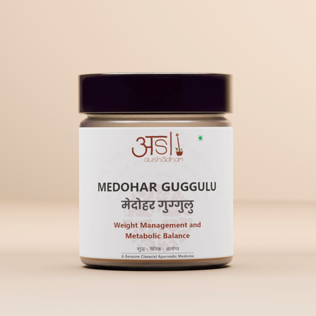 Medohar Guggulu from Asli Aushadham is a traditional Ayurvedic formulation made from a blend of Guggulu (Commiphora mukul) and other herbs like Triphala, Trikatu, and Musta (Cyperus rotundus), ensuring authenticity and quality. It is particularly known for its benefits in weight management and metabolic health.